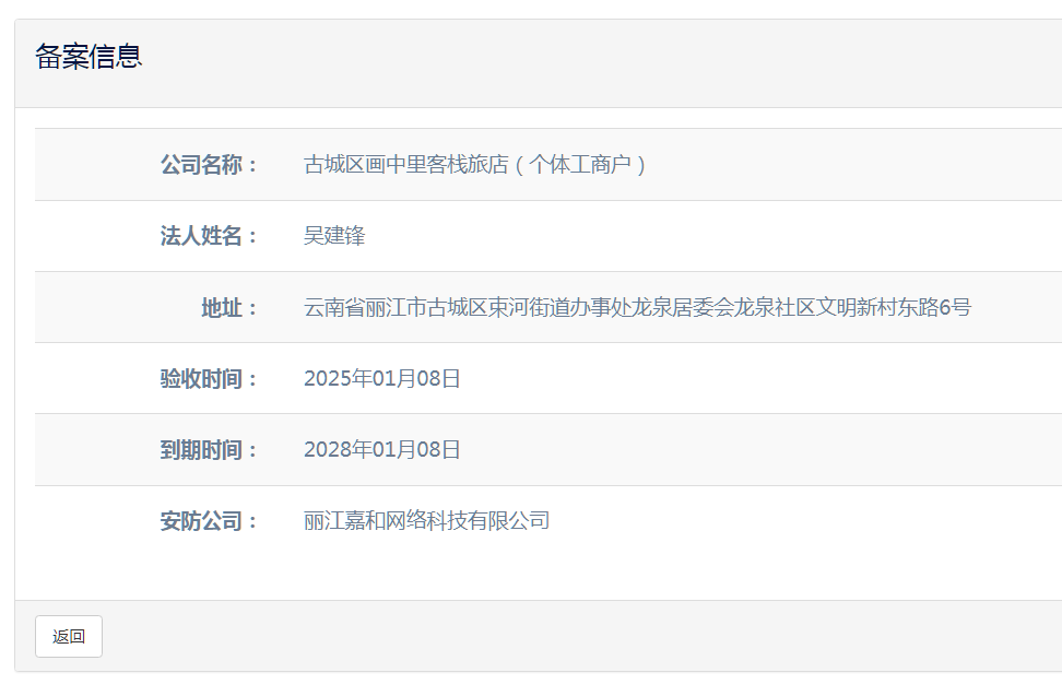 關(guān)于古城區(qū)畫中里客棧旅店(個(gè)體工商戶)電子監(jiān)控安防合格證下證通知