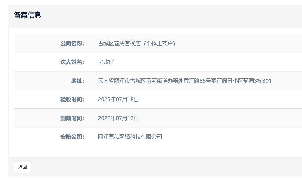 關(guān)于古城區(qū)納云歸舍民宿店(個(gè)體工商戶)電子監(jiān)控安防合格證下證通知