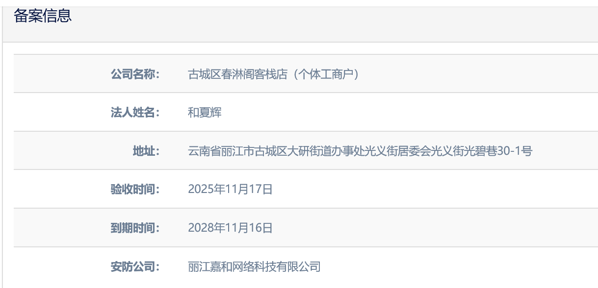關于古城區(qū)春淋閣客棧店(個體工商戶)電子監(jiān)控安防合格證下證通知