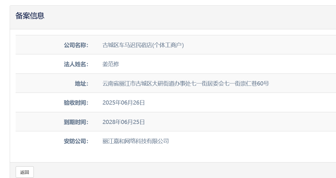 關(guān)于古城區(qū)納云歸舍民宿店(個(gè)體工商戶)電子監(jiān)控安防合格證下證通知