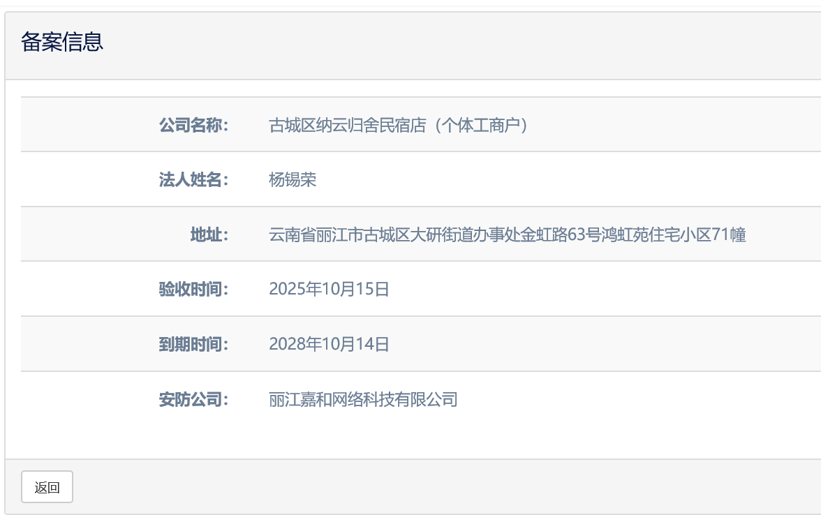 關(guān)于古城區(qū)納云歸舍民宿店(個(gè)體工商戶)電子監(jiān)控安防合格證下證通知