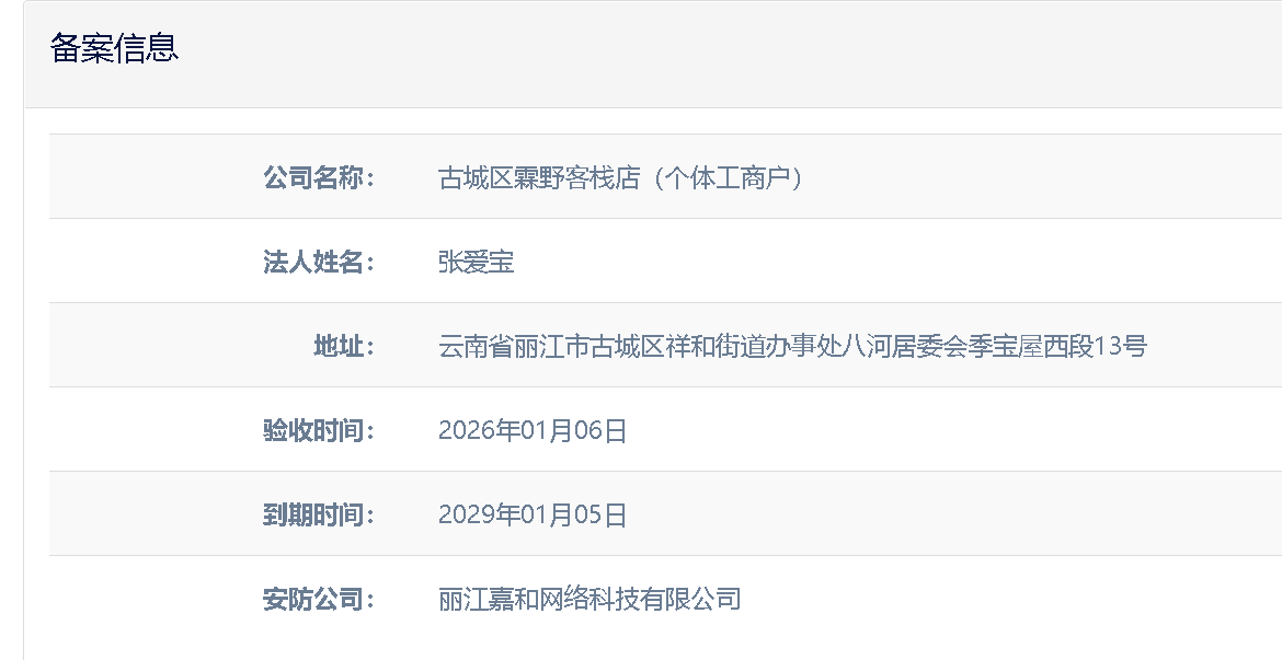 關(guān)于麗江市古城區(qū)留沁院民宿有限責(zé)任公司電子監(jiān)控安防合格證下證通知