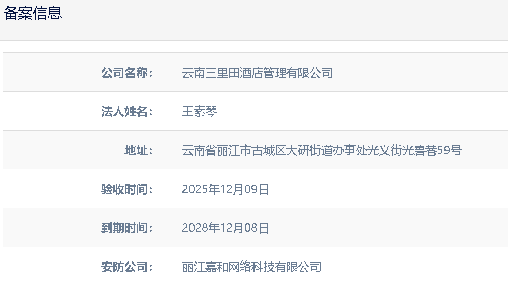 關于云南三里田酒店管理有限公司電子監(jiān)控安防合格證下證通知
