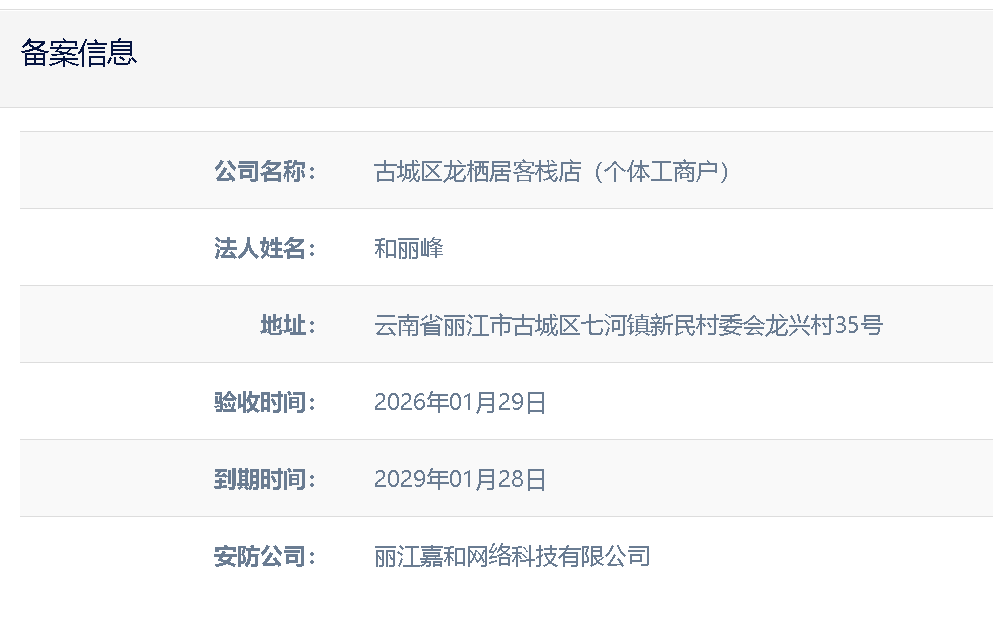 關(guān)于古城區(qū)龍棲居客棧店(個(gè)體工商戶)電子監(jiān)控安防合格證下證通知